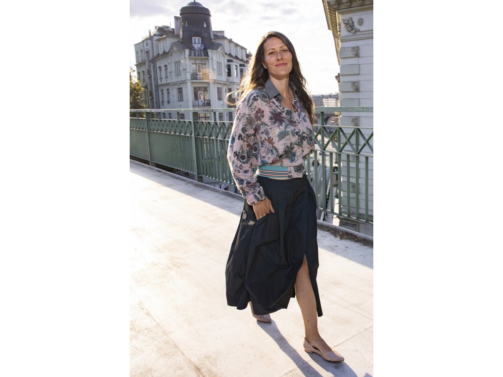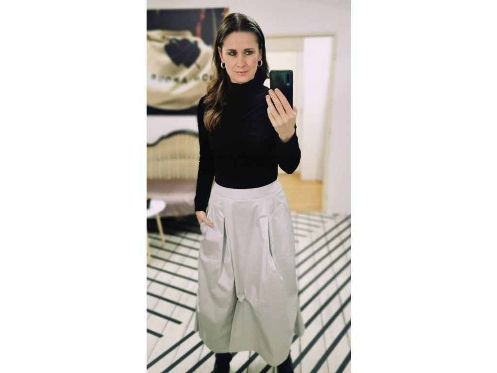 Sukně v pase velmi dobře přiléhá, nabíraná je až níže, díky tomu vyzdvihne pas a boky.